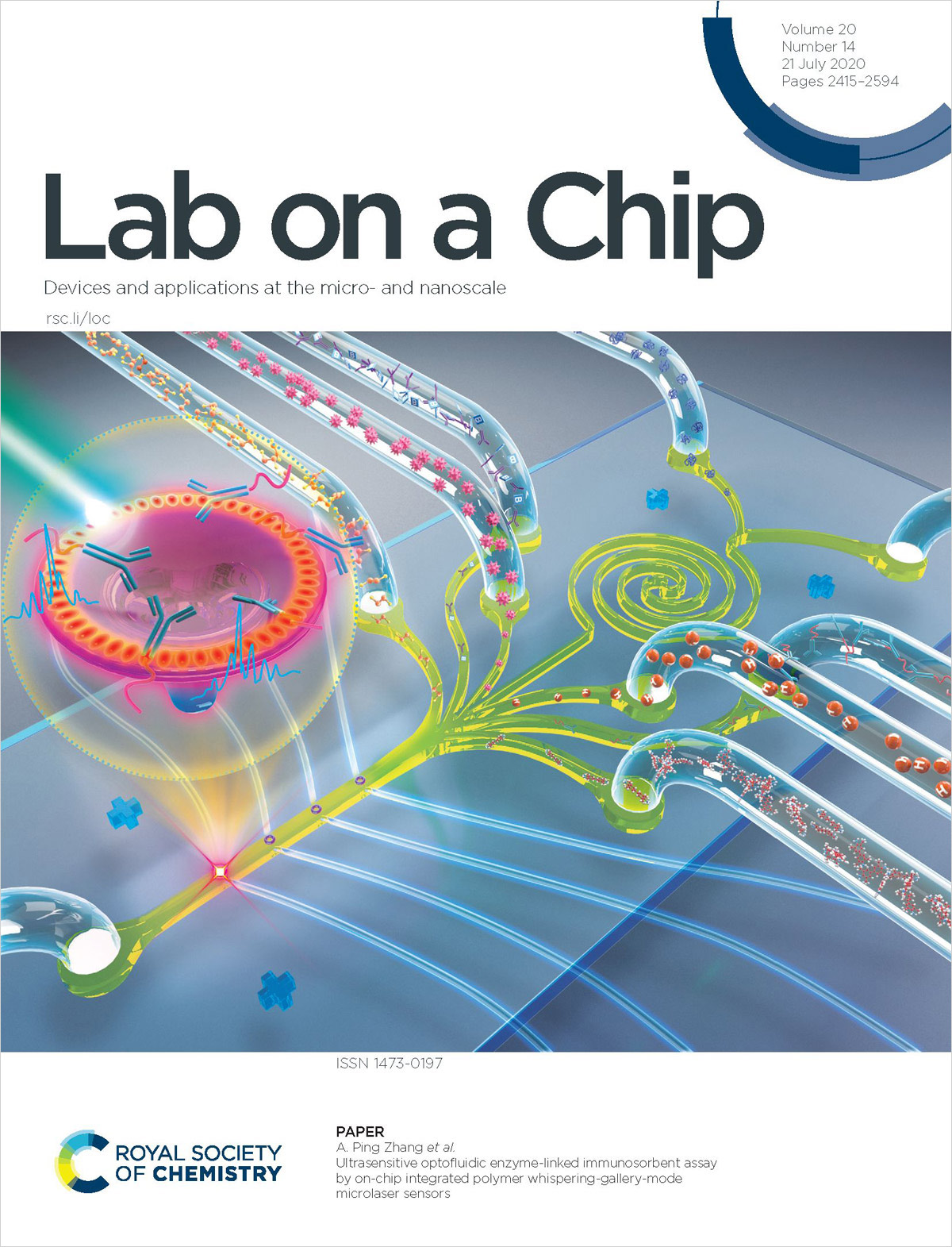 Optical whispering-gallery-mode (WGM) microcavities offer great promise in ultrasensitive biosensors because of their unique ability to enable resonant recirculation of light to achieve strong light–matter interactions in microscale volumes. However, it remains a challenge to develop cost-effective, high-performance WGM microcavity-based biosensing devices for practical disease diagnosis applications. In this paper, we present an optofluidic chip that is integrated with directly-printed, high-quality-factor (Q) polymer WGM microlaser sensors for ultrasensitive enzyme-linked immunosorbent assay (ELISA).
