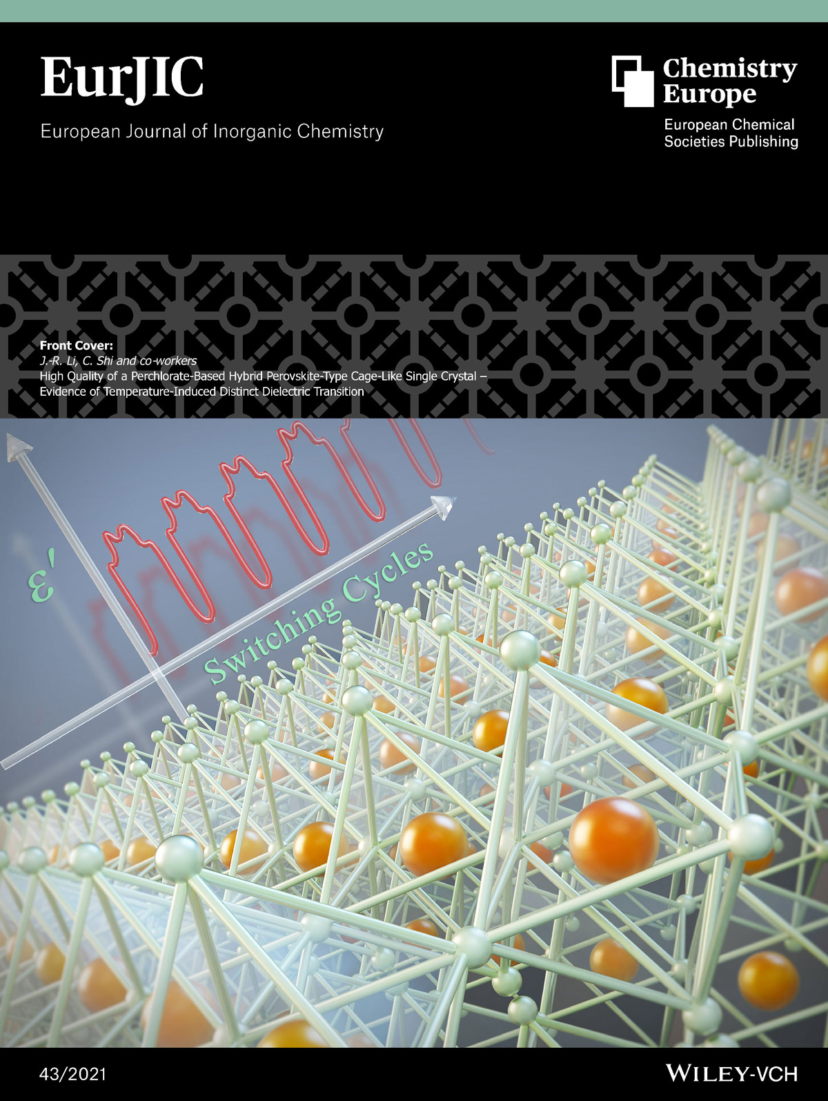 The Cover shows the first three-dimensional Ba-based ABX3 type organic-inorganic hybrid perovskite compound (HTZ)[Ba(ClO4)3] (HTZ = thiazolium cation) with Ba2+ nodes and ClO4− linkers. The compound undergoes two continuous reversible phase transitions at different temperatures accompanied by a change in dielectric constant, which shows the cyclic nature of the switching effect of the material. More information can be found in the Full Paper by J.-R. Li, C. Shi and co-workers.